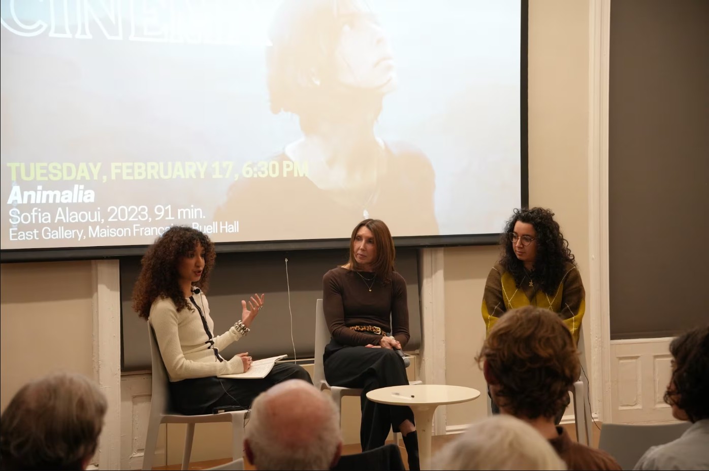 The screening of Animalia, the film debut of French-Moroccan director Sofia Alaoui was followed by a discussion with French and Comparative Literature doctoral candidates Chaima Benhsaina, GSAS ’32, Jihad Azahrai, GSAS ’31, and ICLS Director Undergraduate Studies and French Department Professor Madeleine Dobie (pictured).